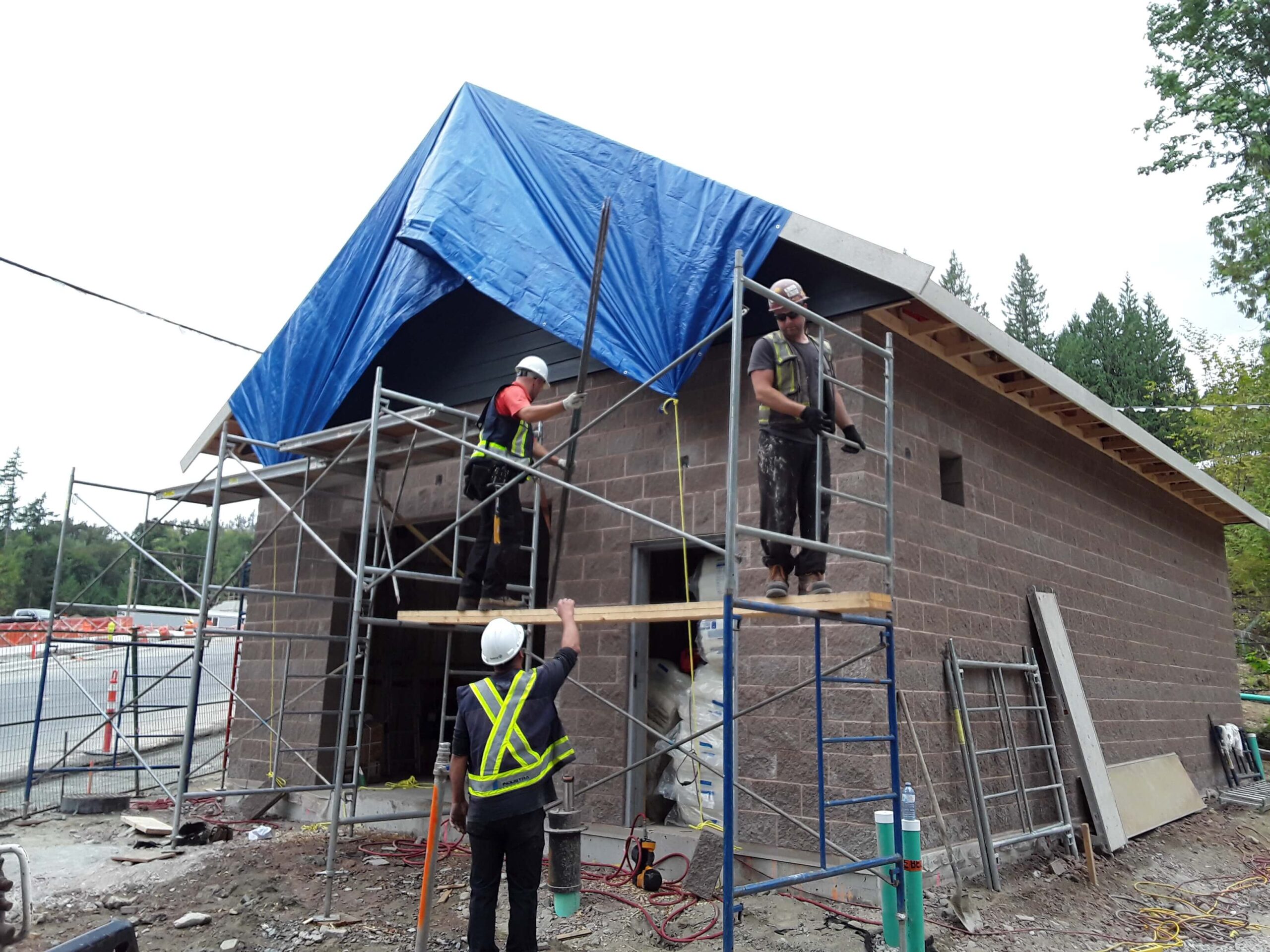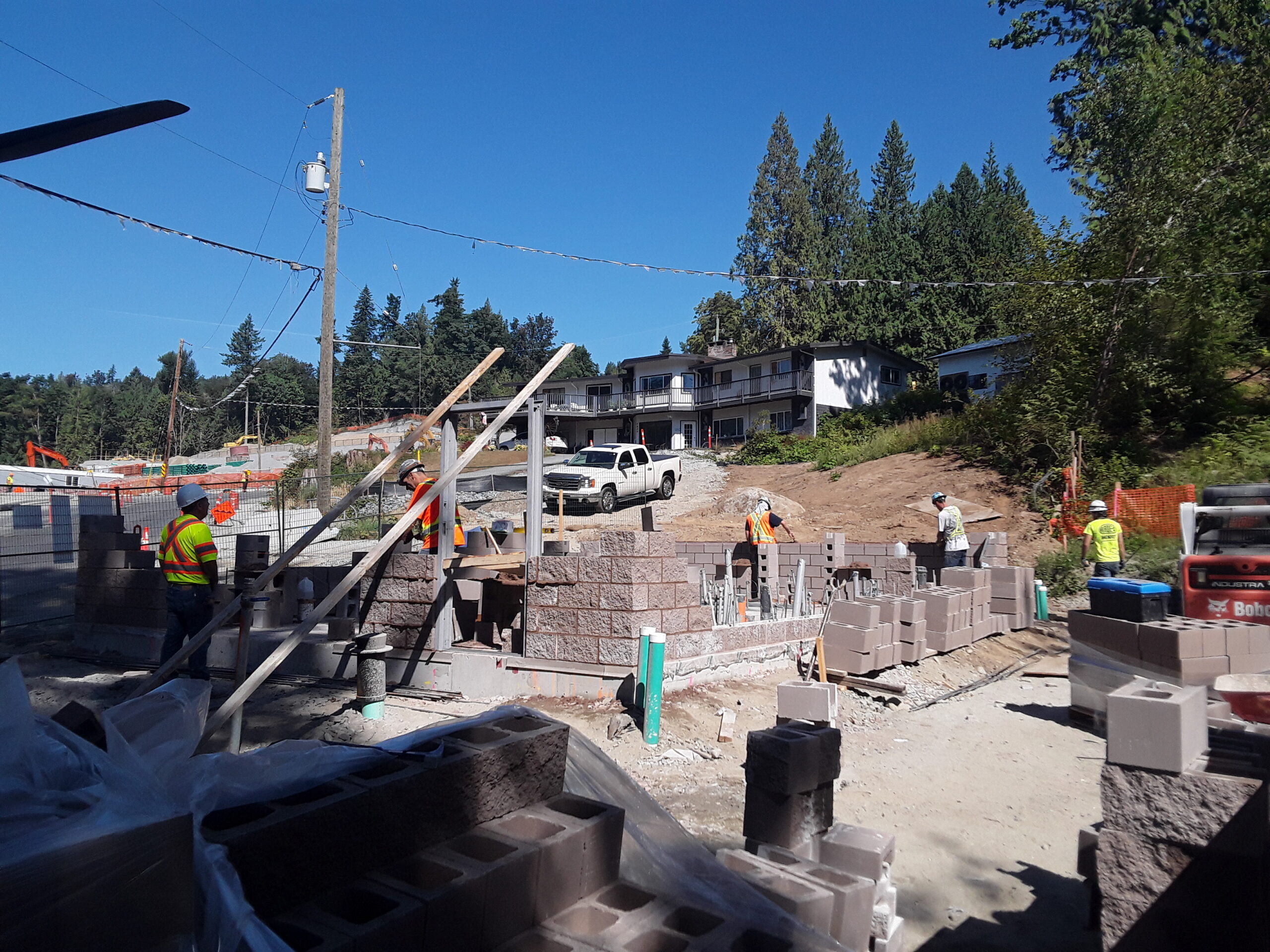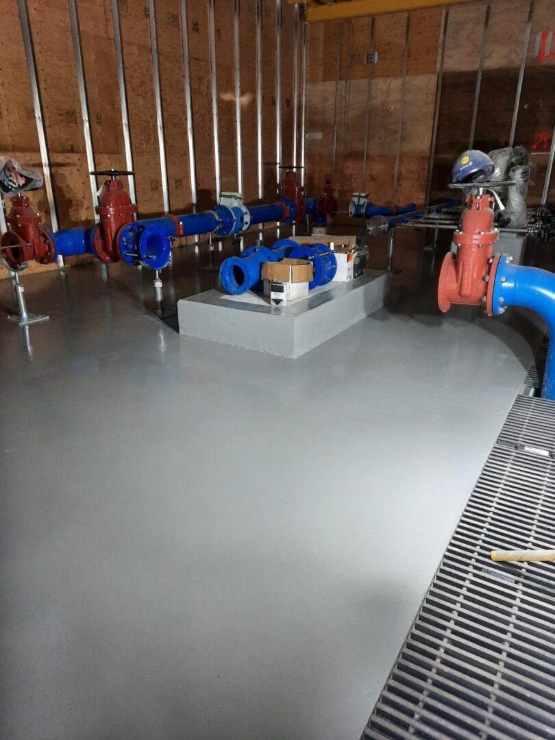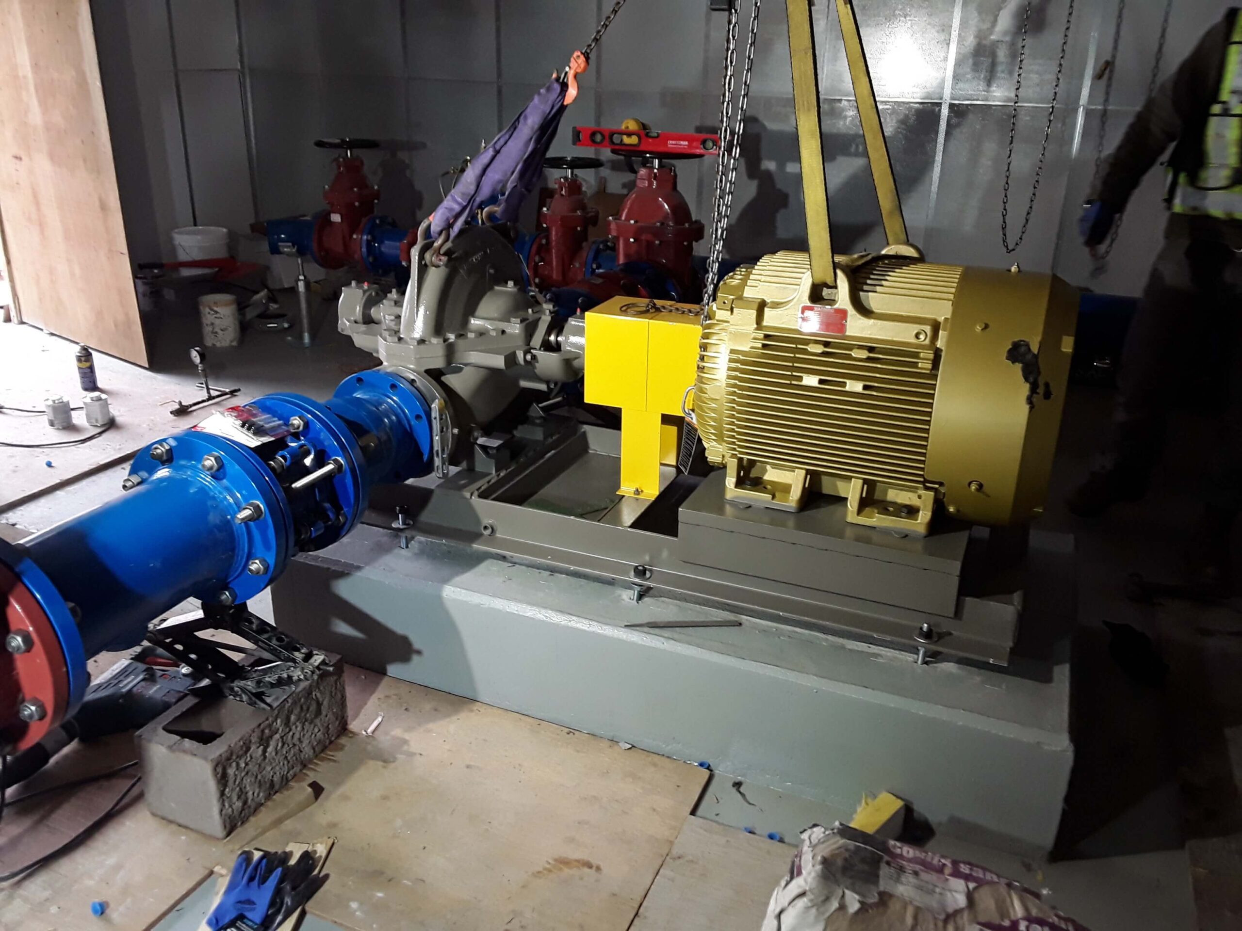 Booster Pump station for a new townhouse development in Mission, BC. The new 900 square foot pump station includes five vertical, multistage centrifugal pumps, a 100 HP horizontal, split case fire pump, epoxy-coated process piping and concrete block wall construction with sheet metal roofing.