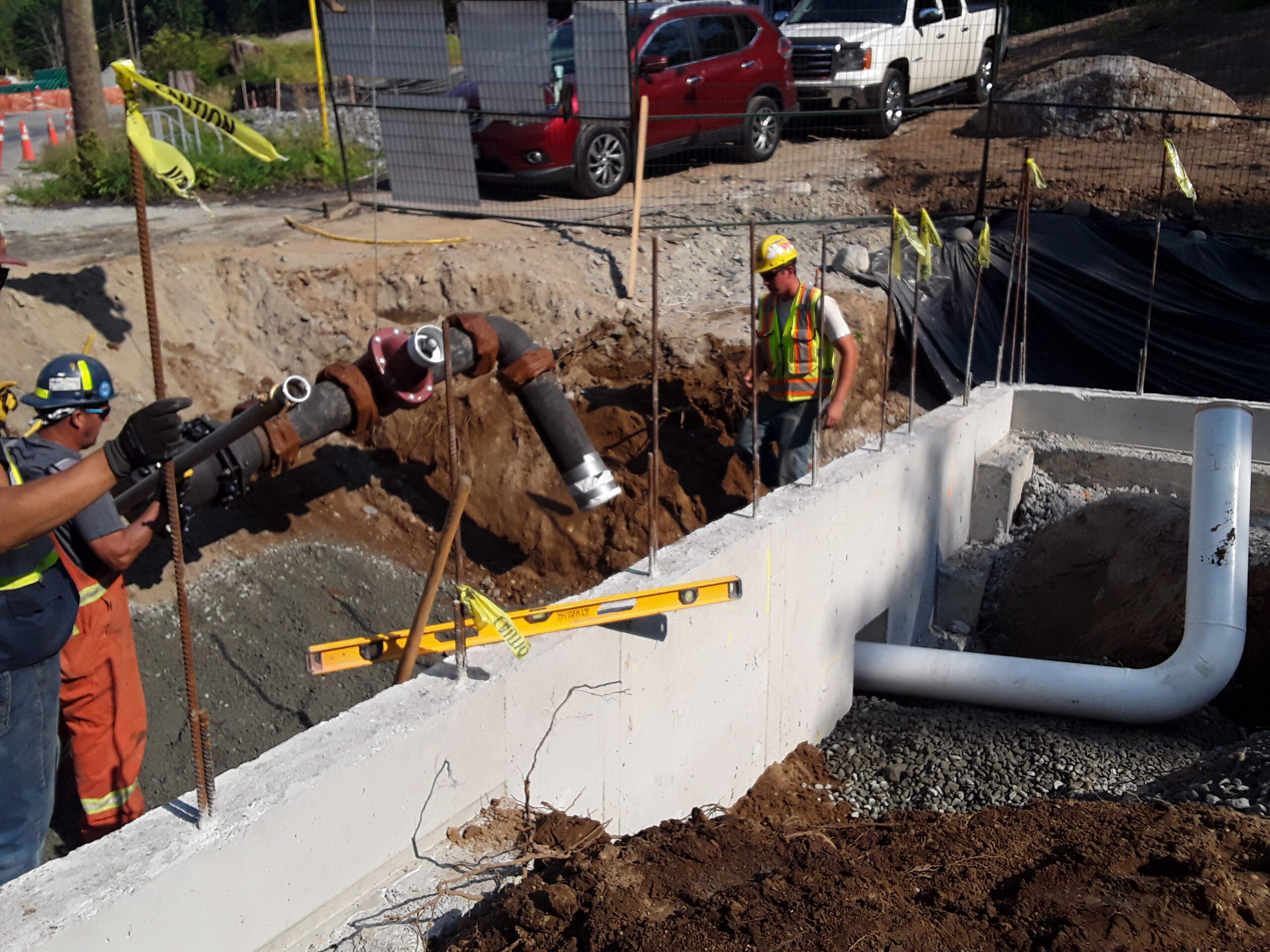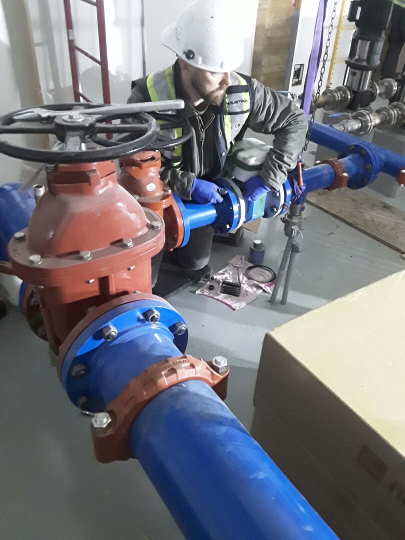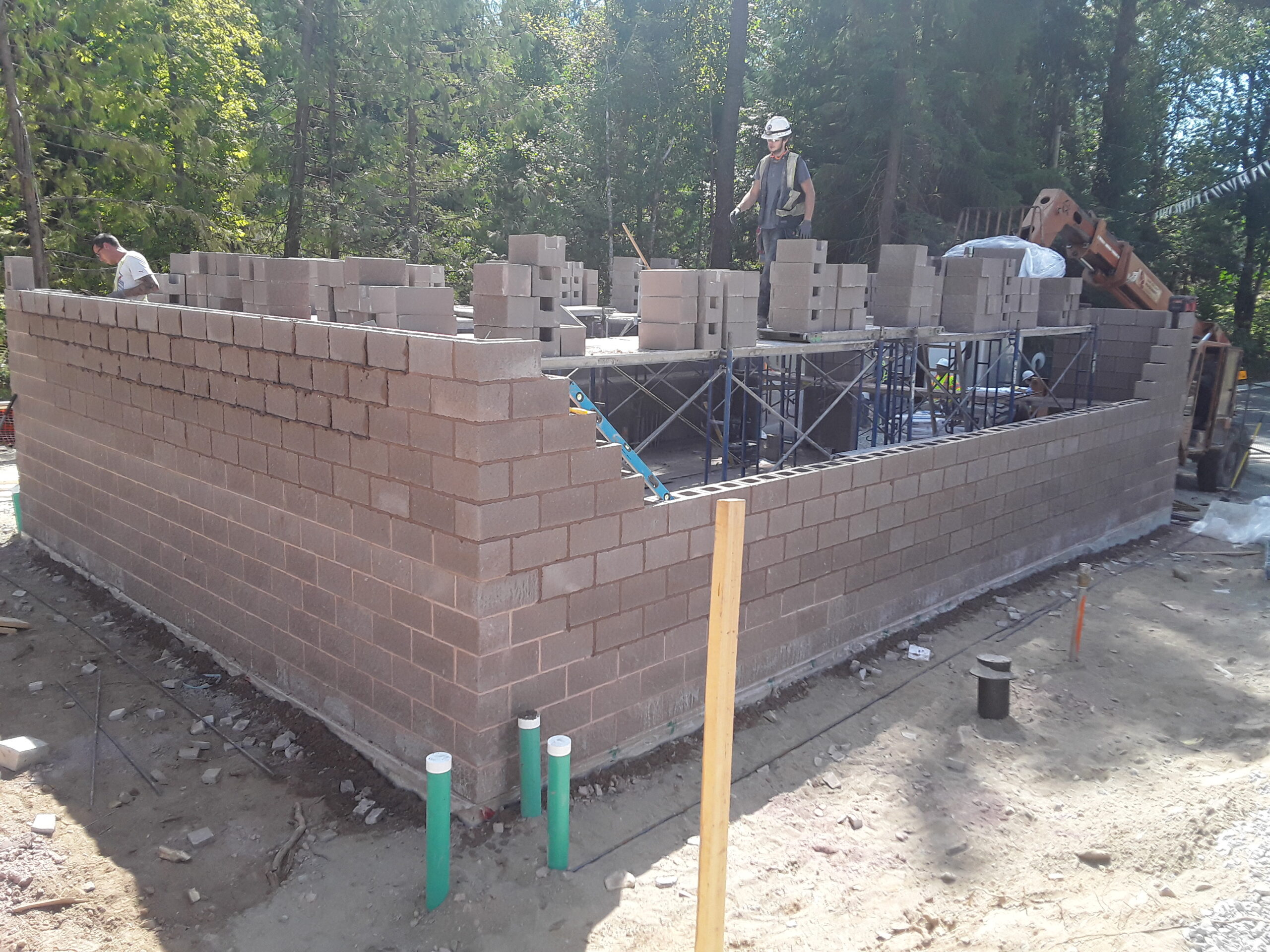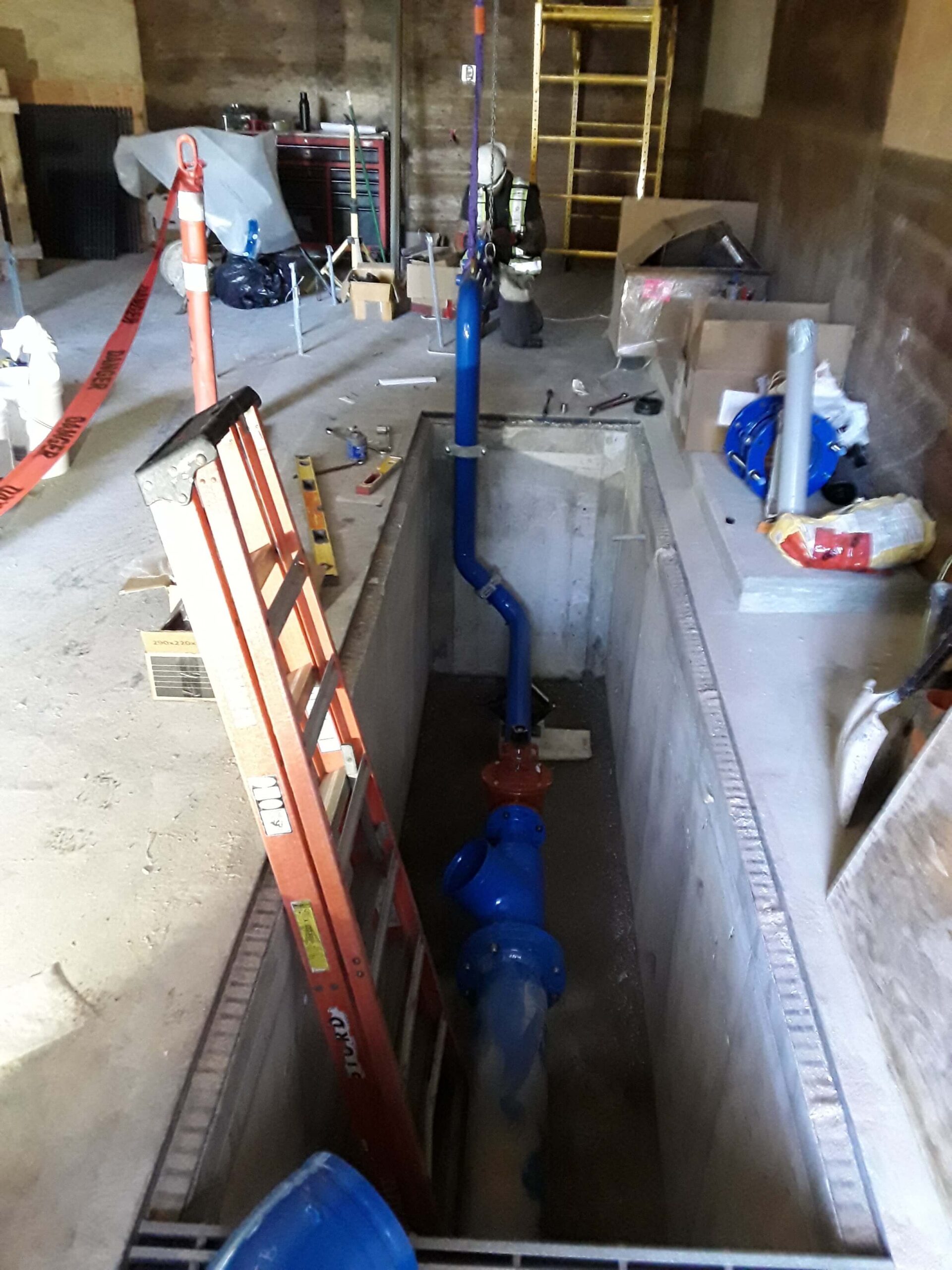 Booster Pump station for a new townhouse development in Mission, BC. The new 900 square foot pump station includes five vertical, multistage centrifugal pumps, a 100 HP horizontal, split case fire pump, epoxy-coated process piping and concrete block wall construction with sheet metal roofing.