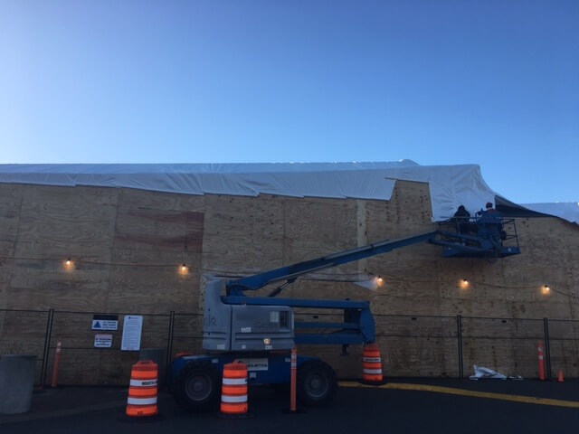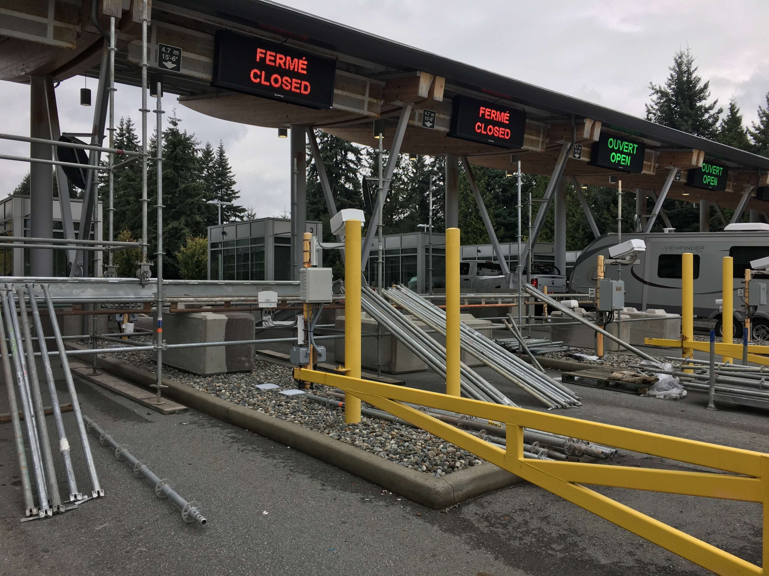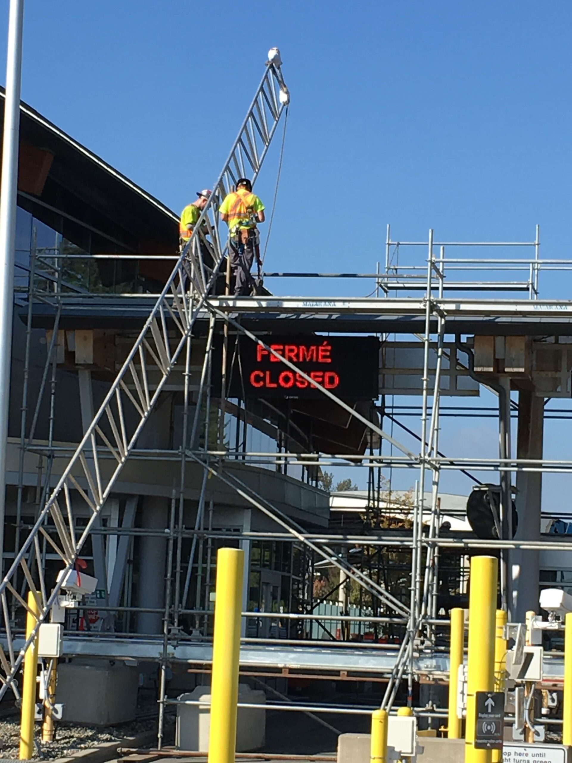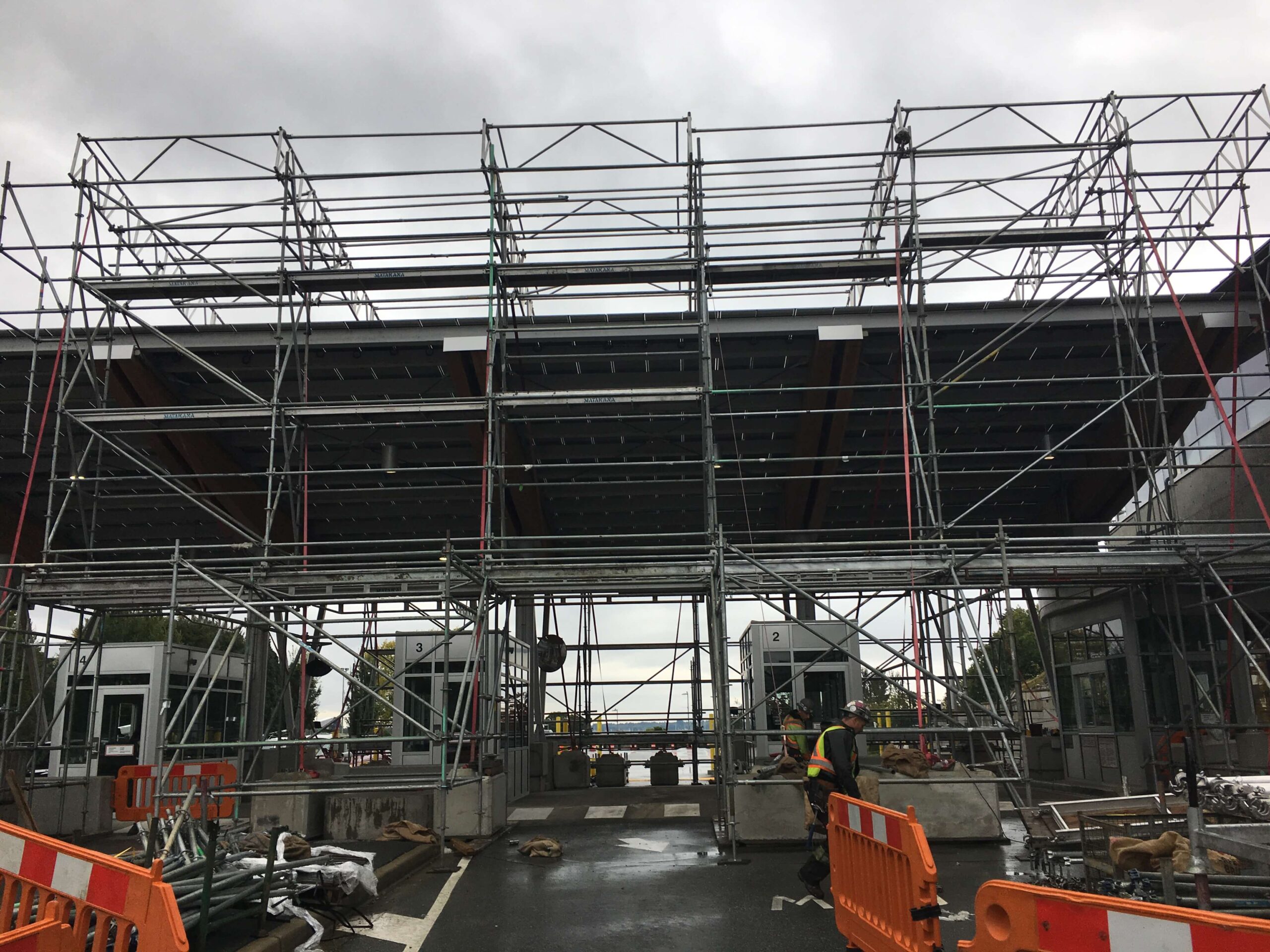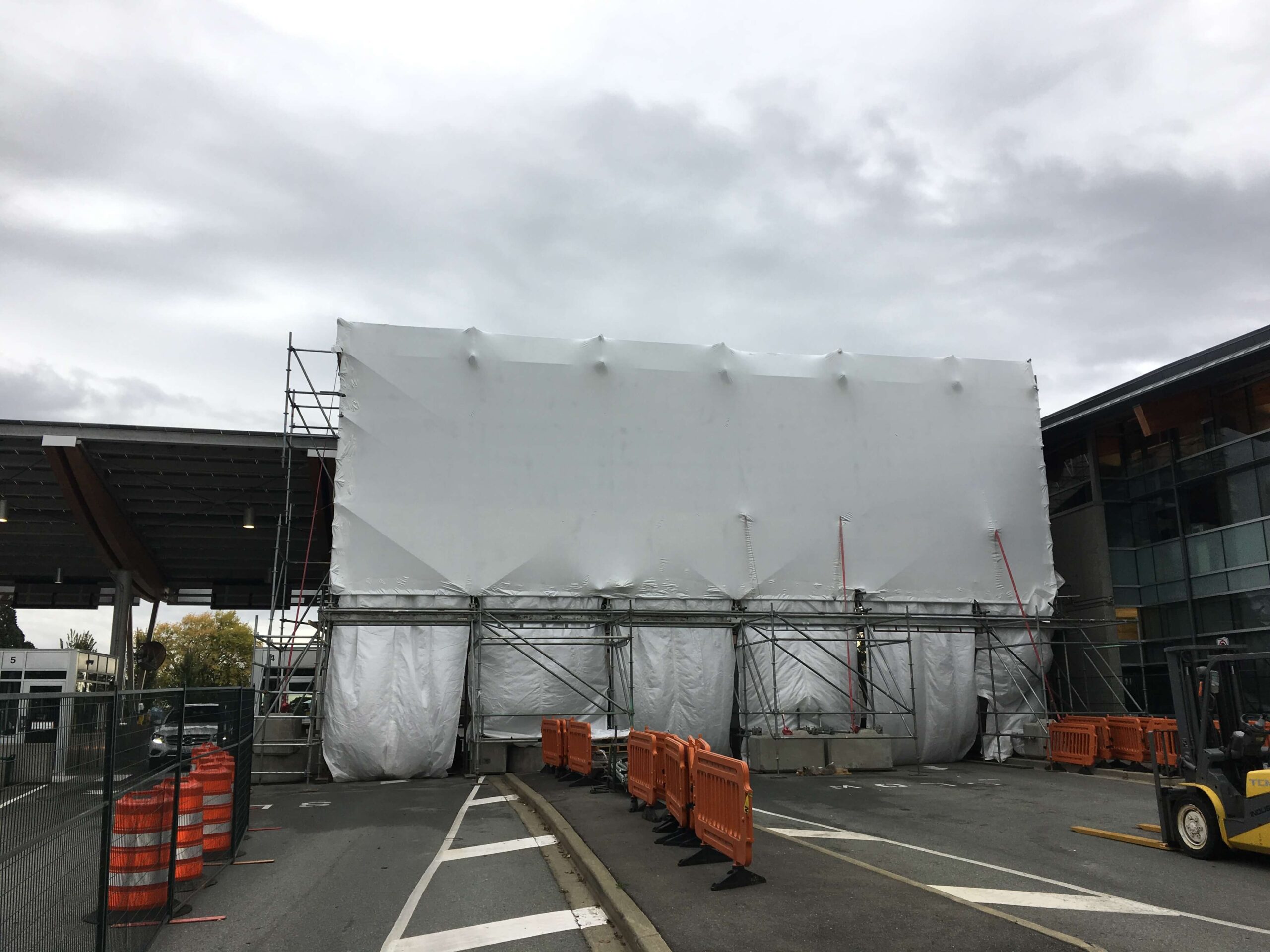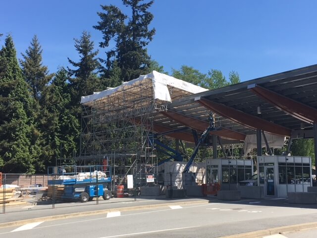 Restoration of the primary, secondary and tertiary border inspection structural canopy areas. Included high pressure sandblast surface preparation of the recoated steel. An engineered tube and clamp scaffold system was installed as the hoarding superstructure with a shrink wrap enclosure. An ambient temperature of 10 degrees was attained with a heating system through the winter months. Significant traffic control and lane closures were required to accommodate access for work and provide full border protection at this busy border crossing.