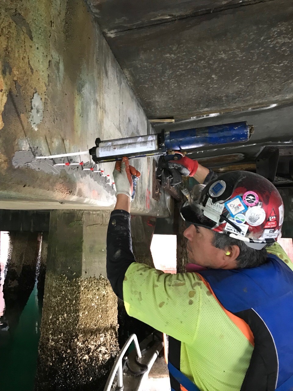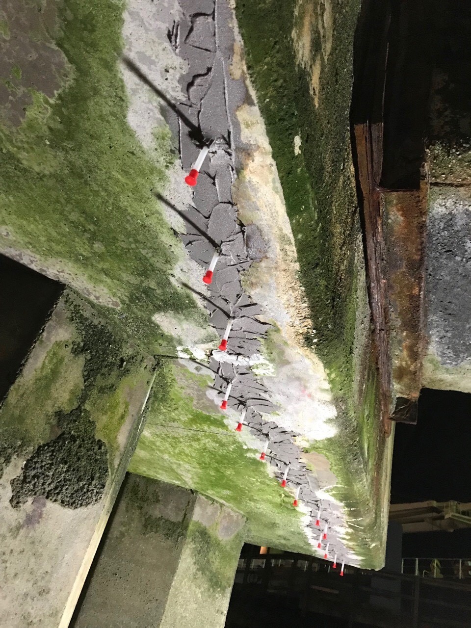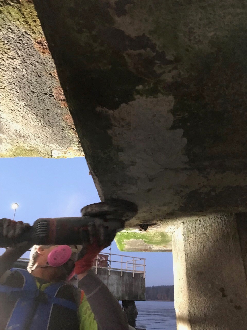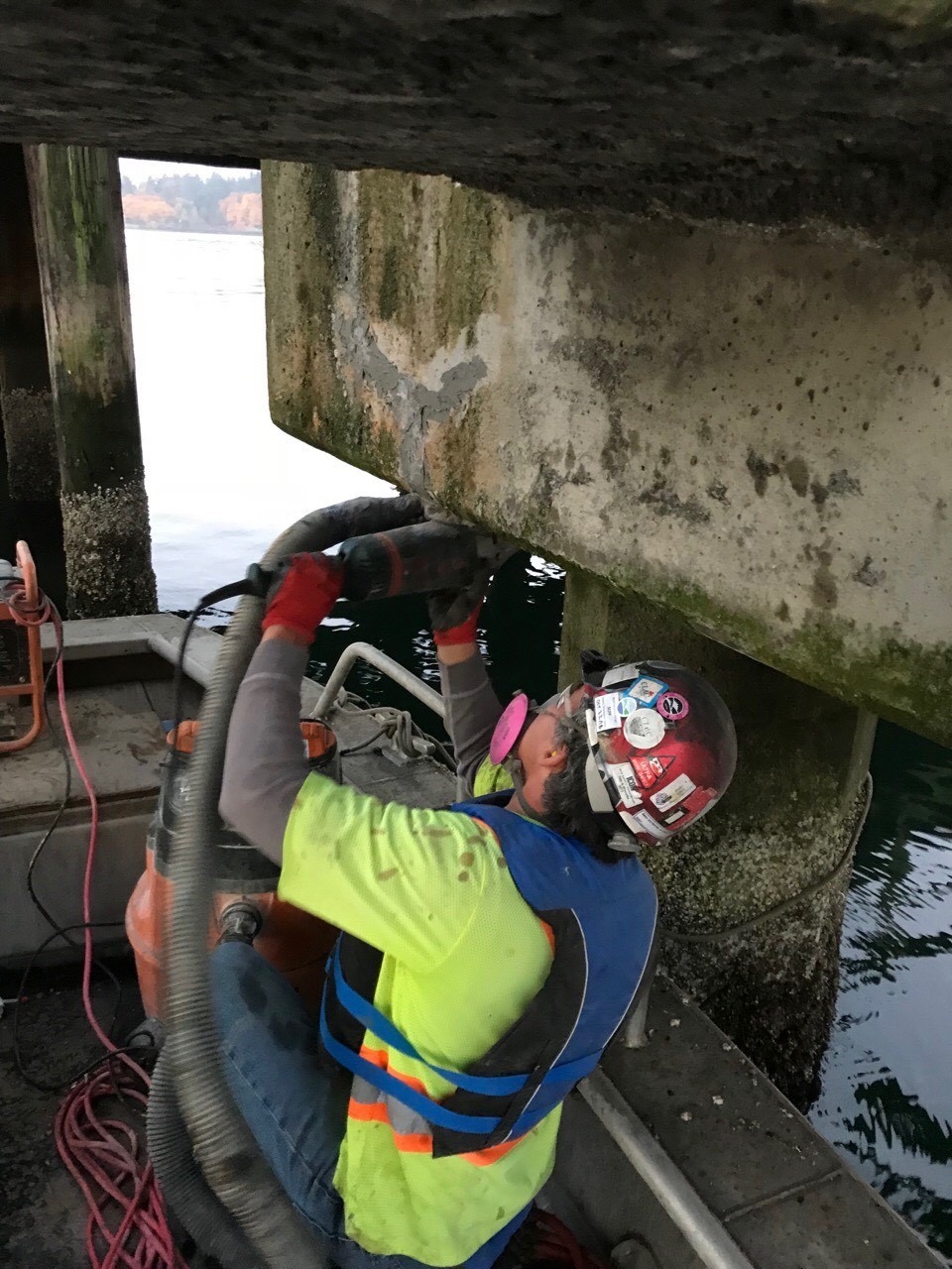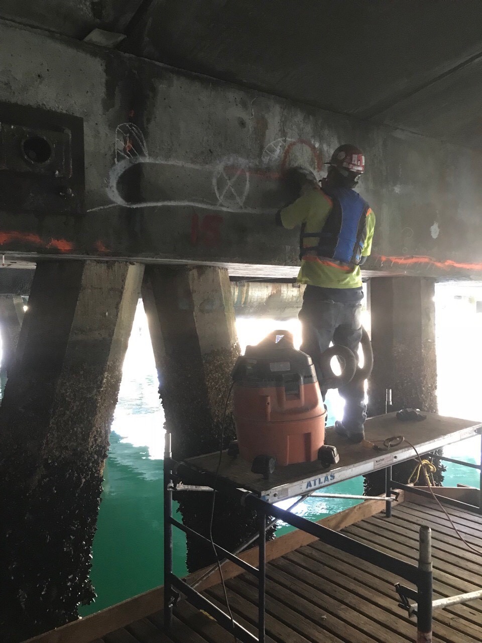 Industra has now completed several concrete wharf structural repair projects for Kinder Morgan/Pembina. This 60-year-old structure requires on-going maintenance and repair. Working from boats and barges, Industra has completed significant repairs involving grinding and chipping concrete, reinforcing steel replacement, structural concrete patching and new concrete formwork. Special netting was suspended to ensure no materials or debris entered the ocean (Burrard Inlet). All work was completed and inspected as per the environmental protection plan.